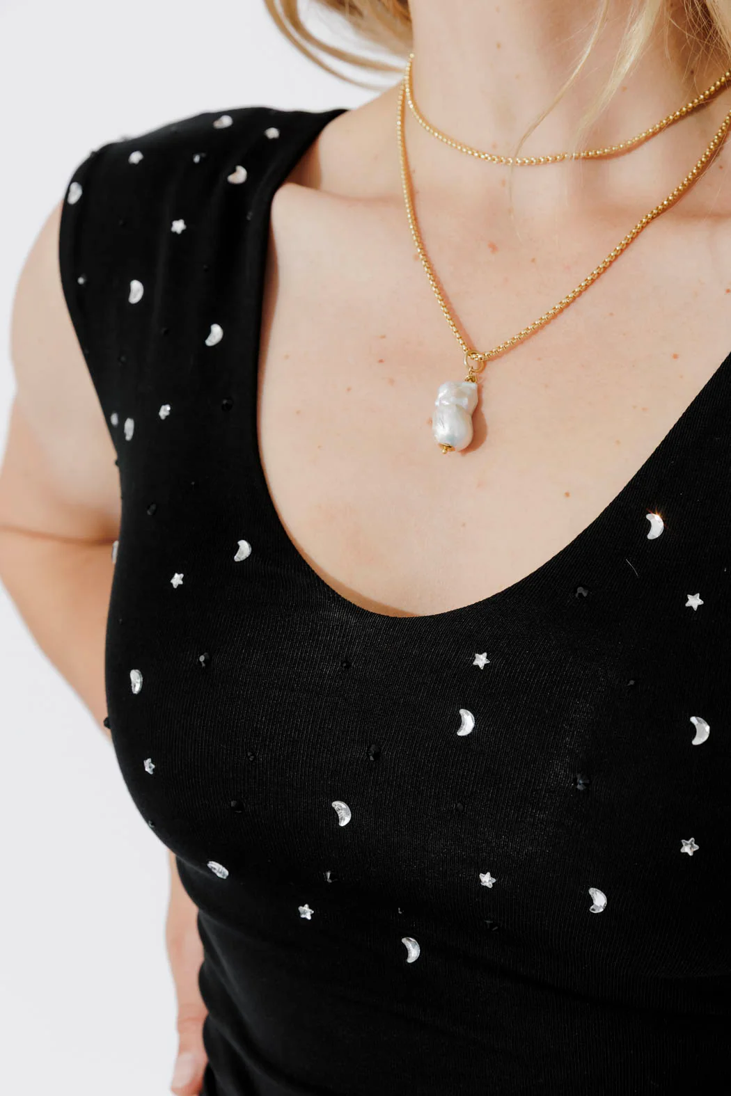 Meet the Black Sparkle Lust Cami — the iconic Motto silhouette you love, elevated with a celestial touch. Crafted from our signature stretch Tencel, this cami gently sculpts the body while feeling beautifully soft and breathable. The front is adorned with delicate moon-and-star sparkle detailing, adding a subtle shimmer that catches the light without overwhelming the look. With its flattering V-neckline, removable shoulder pads and fully lined body, this cami is designed to give you confidence, comfort and just the right amount of glamour.