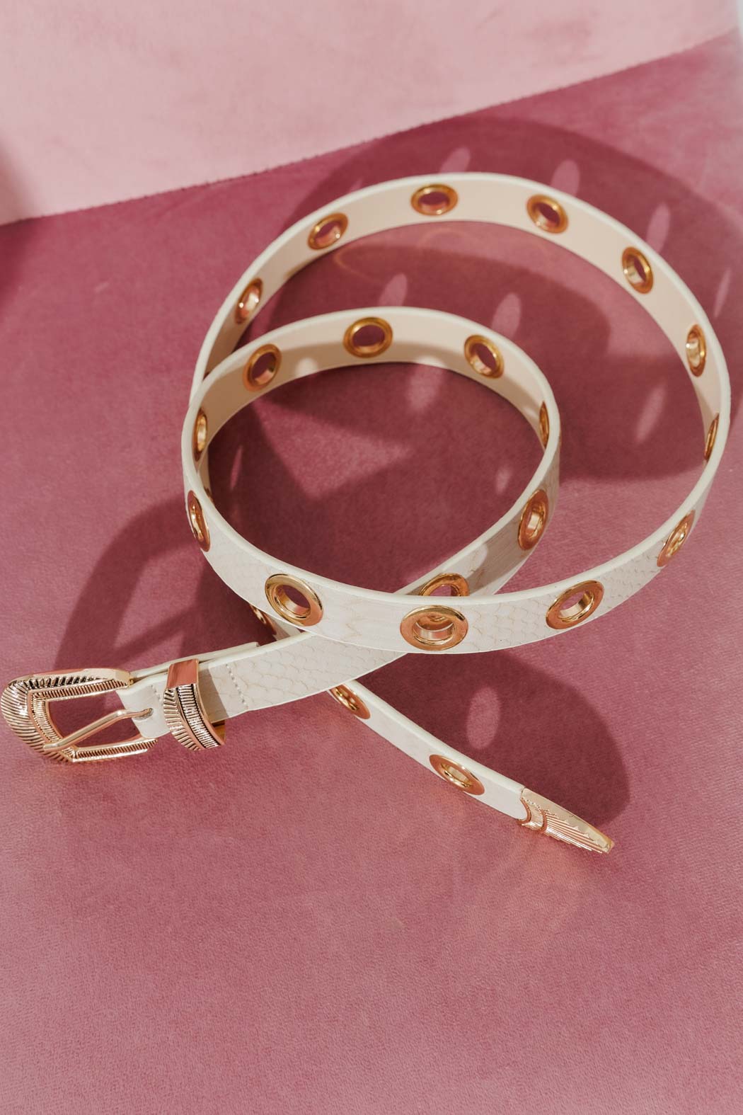 Give your outfit the edge it deserves with the Ivory Eyelet Belt. Crafted in a sleek snake-skin finish with bold metal eyelets and a western-inspired buckle, this accessory is all about attitude and polish. Designed to cinch, shape, and elevate, it's the finishing touch that instantly pulls any look together.