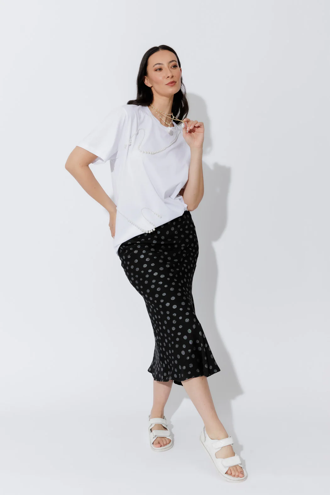 The White Pearl Oversized T-Shirt takes a wardrobe staple and gives it the Motto touch — relaxed, refined, and just a little bit glam. Crafted from luxurious mercerised cotton with the perfect hint of stretch, this tee feels soft, smooth, and ultra-comfortable against the skin. The oversized silhouette drapes effortlessly, while pearl studs add a polished, feminine edge. It's your everyday tee, but elevated to statement status.